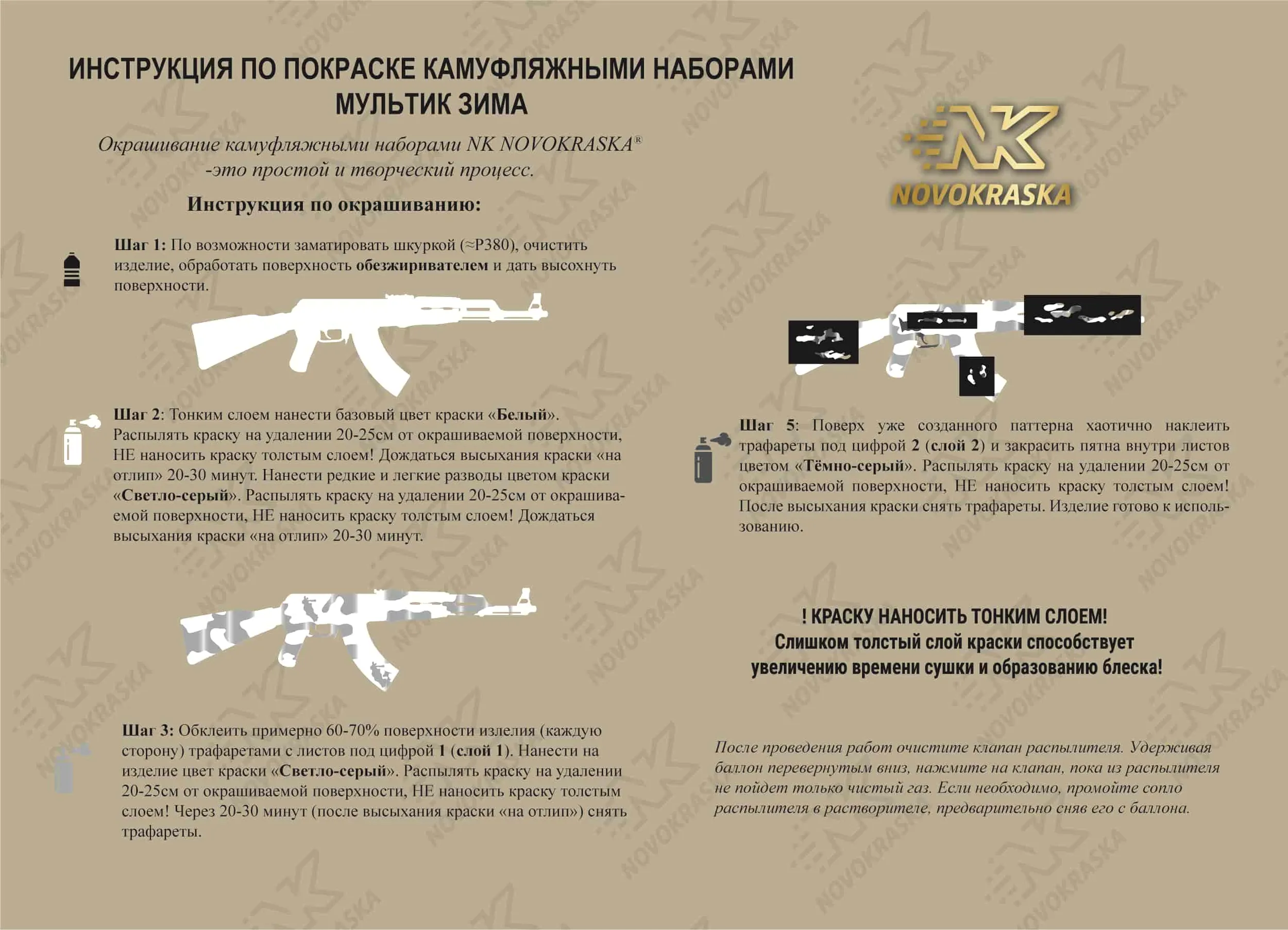 Первый слой-базовый, далее нанесение слоев производится при помощи трафаретов согласно инструкции в зависимости от камуфляжного набора. Интервал времени между нанесением слоев – 15-20 минут (время высыхания на отлип).