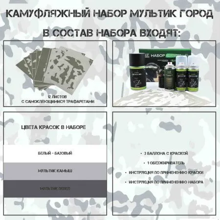 - баллоны с износостойкой оружейной краской - 3 цвета - обезжириватель в аэразольном баллоне (подходит в том числе для чистки оружия) - 1 шт. - комплект высококачественных оружейных трафаретов Multicam - 1 шт - подробная инструкция по нанесению камуфляжа