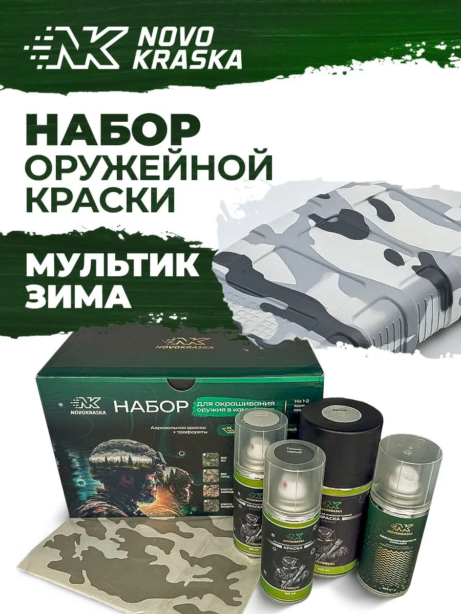 Уникальный набор не имеет аналогов на рынке и предназначен для покраски боевого, спортивного или страйкбольного оружия в полевых условиях. Данный набор придаст вашему оружию новый внешний вид, обеспечит оружие высокими маскировочными свойствами и позволит подчеркнуть вашу индивидуальность. Уникальные свойства оружейной краски Титаниум от NK Novokraska надолго защитят ваше оружие, шлем, бинокль и другие элементы экипировки. Оружейное покрытие Эн Кей выдерживает перегревы и механические воздействия, не выцветает и имеет низкую ИК ремиссию, что позволит снизить вашу заметность при использовании приборов ночного виденья. Специально подобранная цветовая палитра и трафаретный рисунок обеспечат полное сходство с камуфляжной формой и отличную маскировку на местности. Российская оружейная краска Эн Кей Новокраска - это гарантия качества и долговечности по доступным ценам.