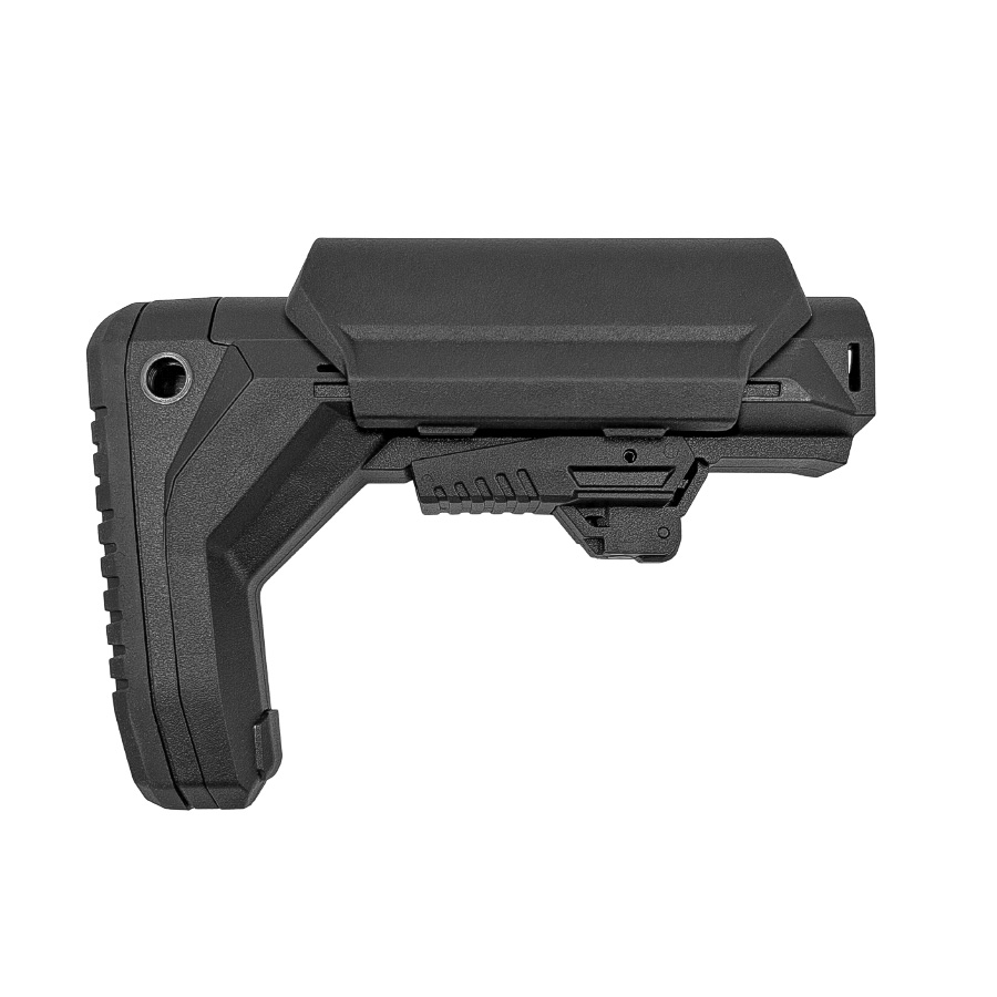 - Текстурированный затыльник из мягкого материала обеспечивает надёжный упор в плечо или бронежилет, не скользит.
